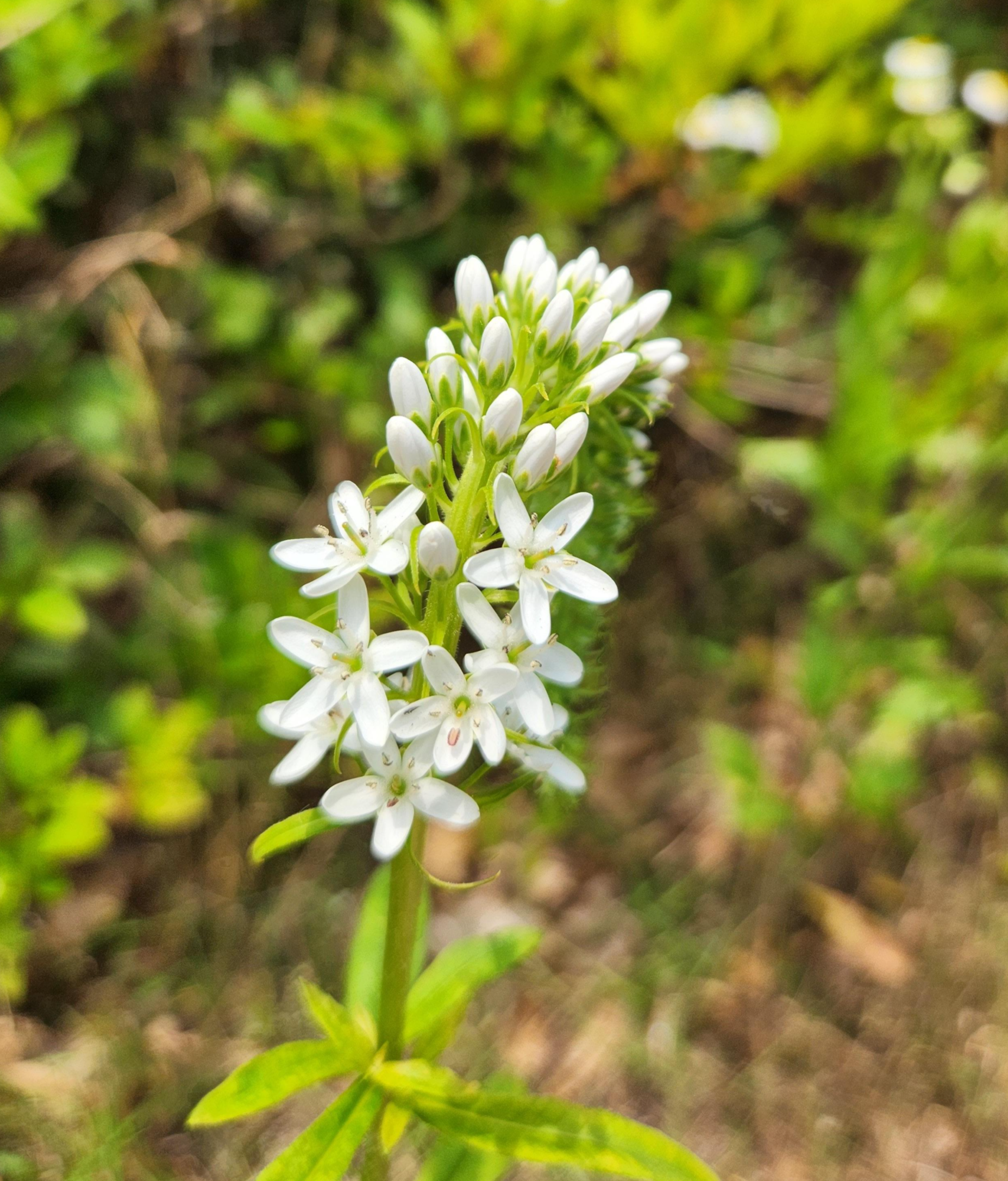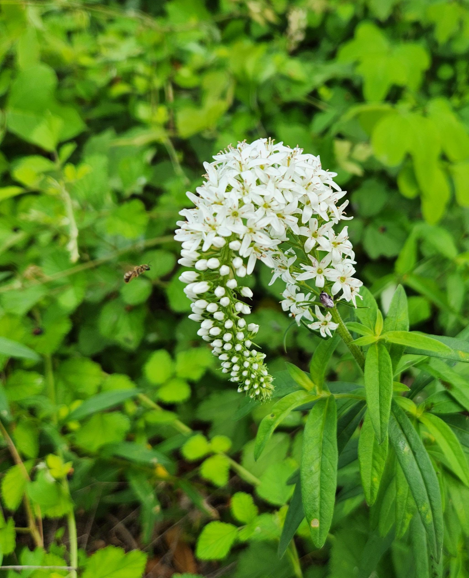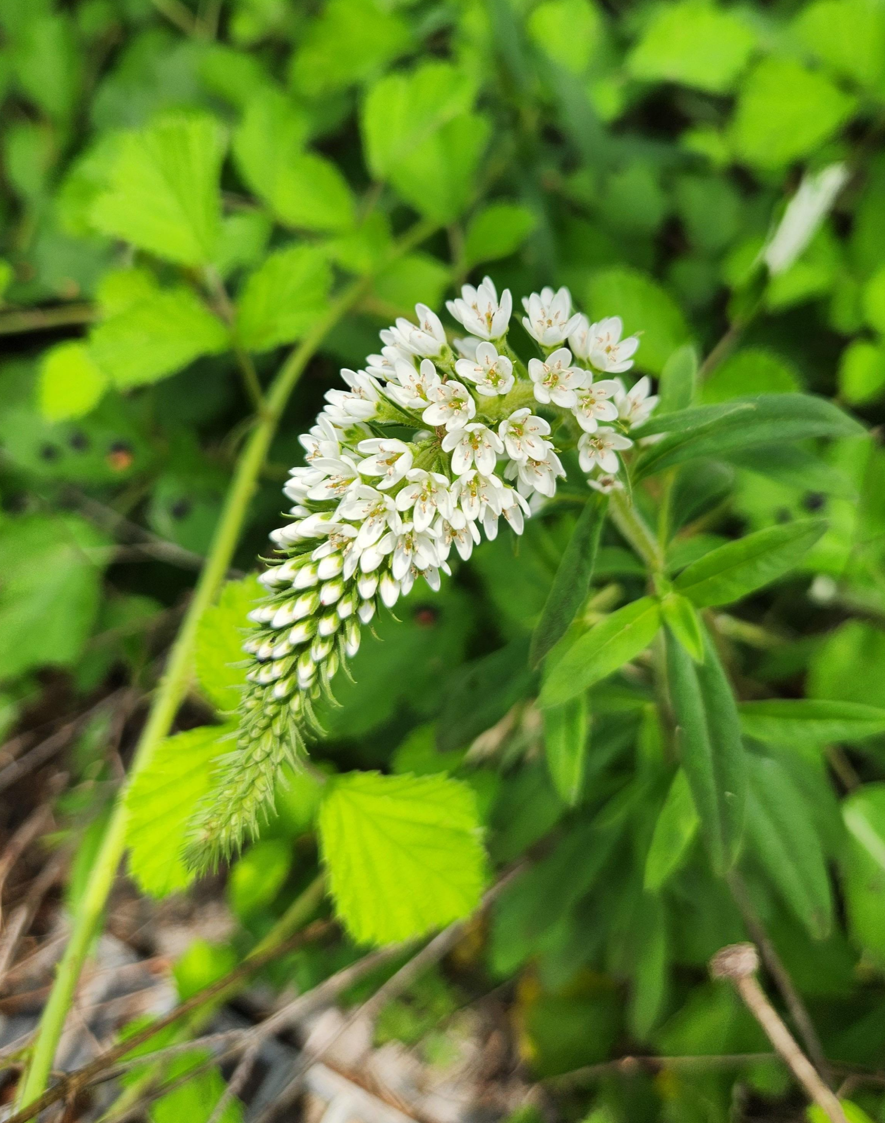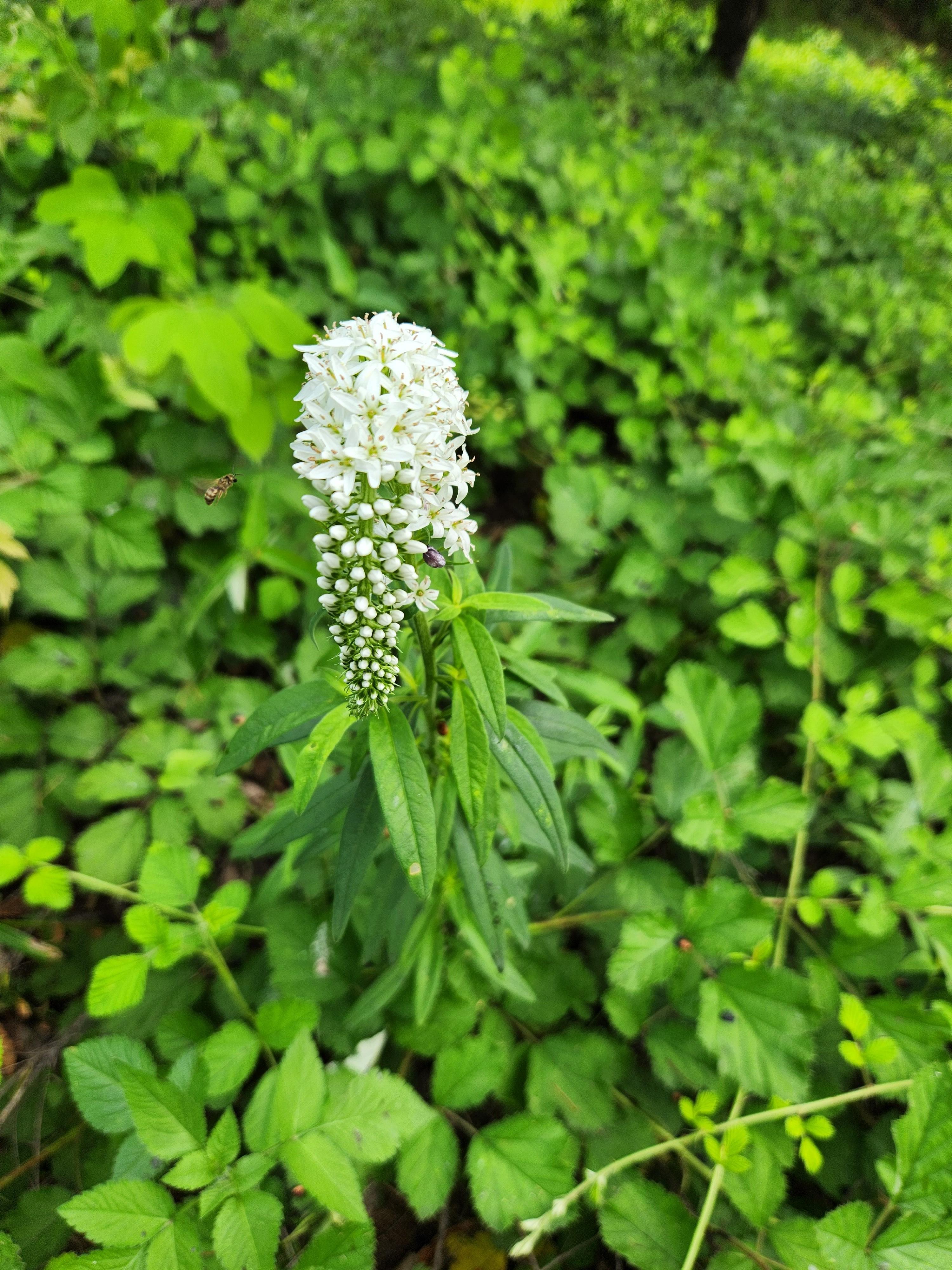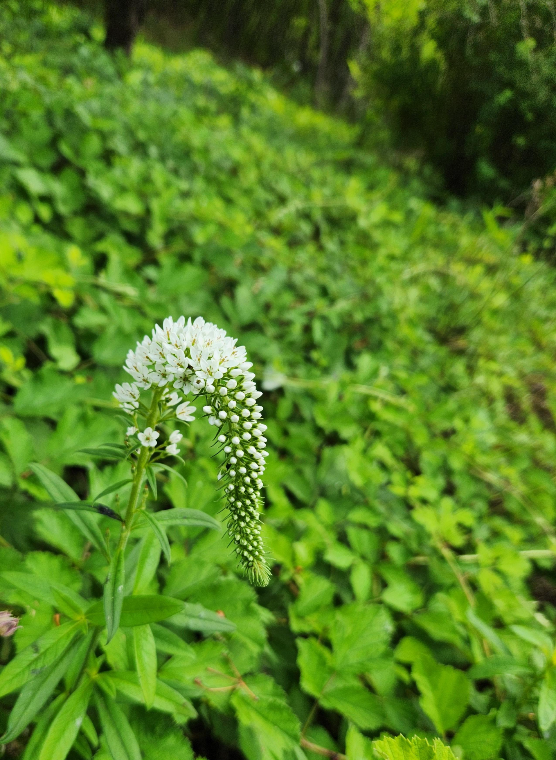6-7월에 원줄기 끝에서 한쪽으로 굽은 총상꽃차례가 나와서 백색 꽃이 밀착하며 꽃차례는 길이 10-20cm이지만 결실기에는 길이가 40cm에 이른다. 꽃자루는 길이 6-10mm로서 잔털이 있으며 밑부분에 선상의 포가 달린다. 꽃 부분은 5 수이고 꽃받침조각과 꽃잎은 좁고 긴 타원형이며 지름 8-12mm이고 암술은 1개이다.