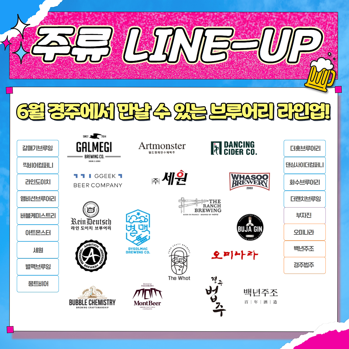 * 수제맥주 : 세원, 더랜치브루잉, 아트몬스터, 버블케미스트리, 몽트비어, 화수컴퍼니, 갈매기브루어리, 앰비션브루어리, 라인도이치, 별맥브루잉, 끽비어컴퍼니, 댄싱사이더, 더홋브루어리