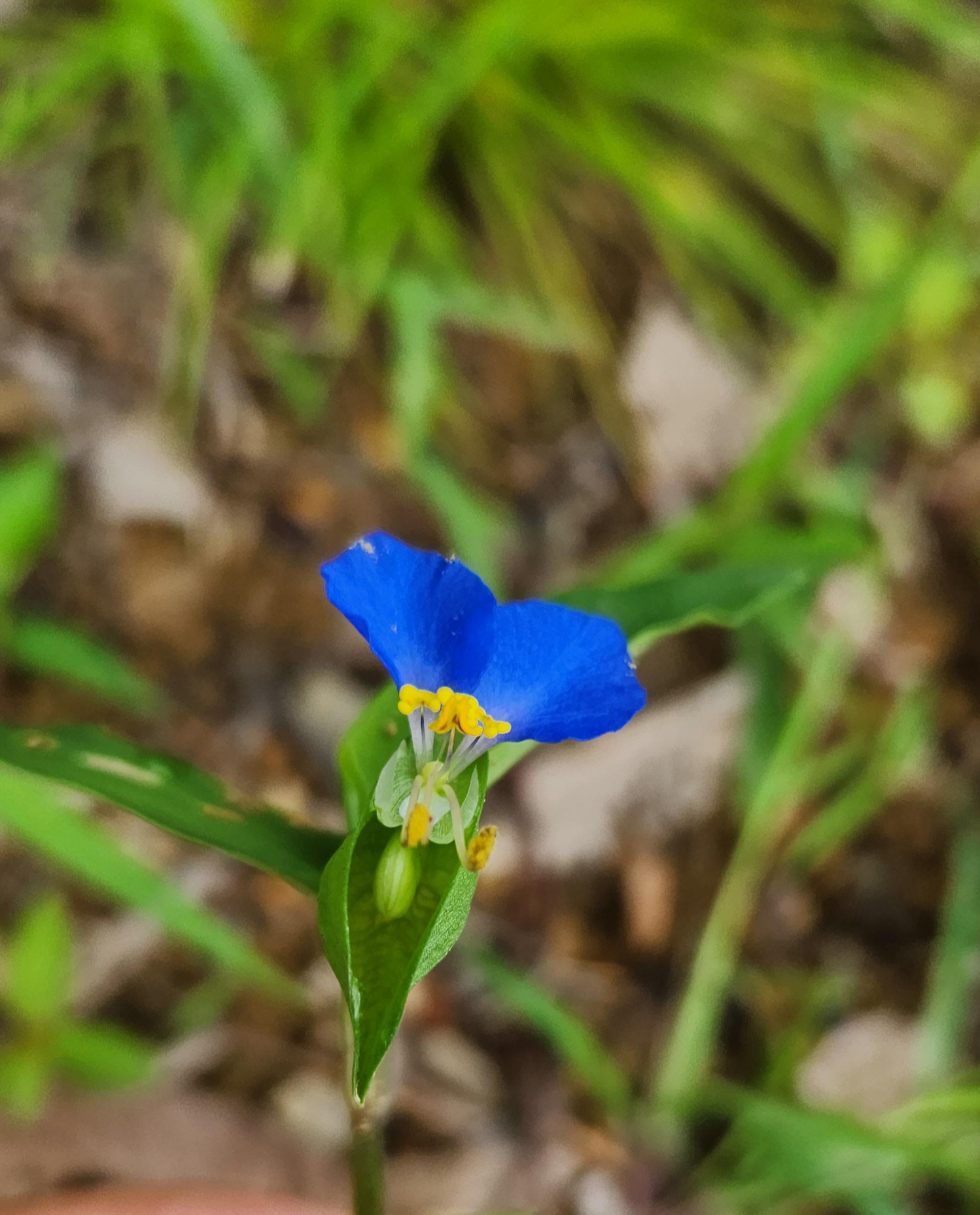 꽃은 7-9월에 잎겨드랑이에서 나온 꽃대에서 파란색으로 핀다. 겉에 있는 꽃잎 3개는 색이 없고 작으며, 안쪽 꽃잎 2개는 파란색, 1개는 색이 없다. 수술은 꽃밥이 있는 수술이 2개로 노란색을 띠어 마치 곤충의 더듬이 모양이며, 꽃밥이 없는 헛수술은 4개이다. 열매는 타원 모양의 삭과이고 마르면 3개로 갈라진 속에 검은색의 씨가 있다.