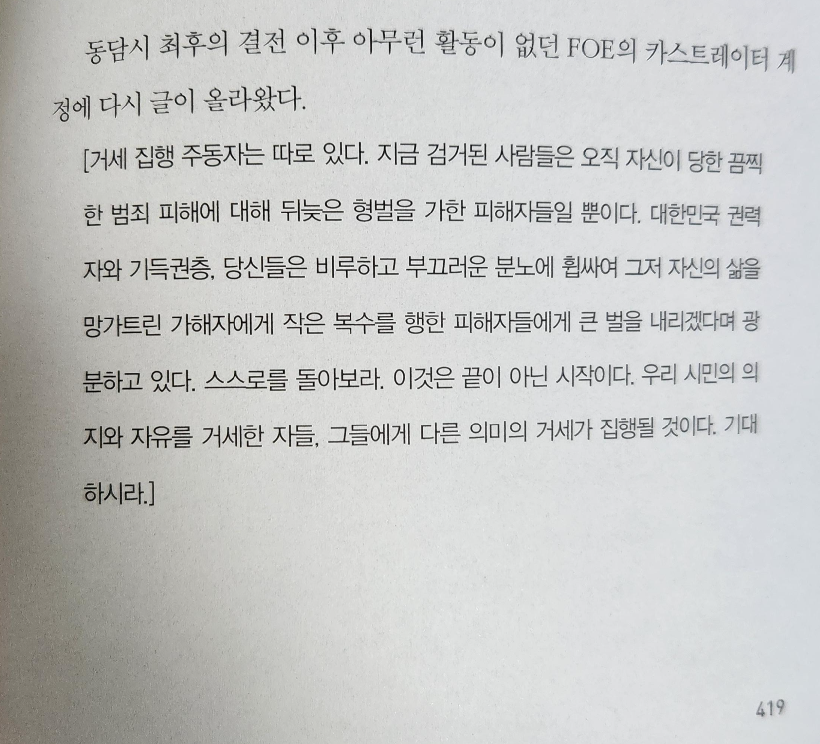이 소설의 성범죄자들을 단죄하는 그들의 집단이 정당화 될 수는 없다. 하지만 얼마나 이 사회가 부패하며 제대로 된 법집행 이루어지지 않는지 우리는 잘 알고 있다. 그들은 제대로 된 처벌을 받아야 마땅하다.