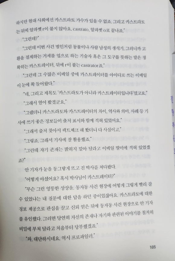 티브에서 본업을 하실때는 끌어당기는 힘이 있으셨는데 소설은... 너무 많은 걸 알려주려 하시고 자세하게 풀어내는 바람에 읽는 내내 힘들었다. 수많은 등장인물들. 어려운 용어들, 드라마 극본 같은 대사처리들 행동 묘사의 나열들이 글의 집중도를 방해되었다. 등장인물들의 서사들이 너무 길다 보니 핵심적인 내용 전달이 그저 카스트라토만 떠오게 했다.