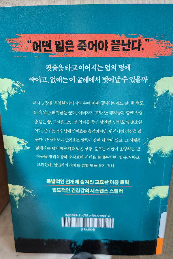 두 사건을 하나의 연결 고리로 만드는 시점부터 좀 몰입도가 반감이 되었다. 박한서 형사나 준서의 서사가 좀 더 나와야 이해가 될텐데...많이 아쉬웠던 부분이다. 왜 그래야만 했는지 독자가 짐작은 할 수 있는 스토리지만 납득은 안된다고나 할까? 살인자 백상과 살인을 하려고 했던 준우를 보며 피는 타고 나는 걸까? 환경 때문에 만들어 지는 걸까? 돼지의 피가 아닌 인간의 본성에 대해 한번쯤 생각하게 만드는 소설책이였다.
