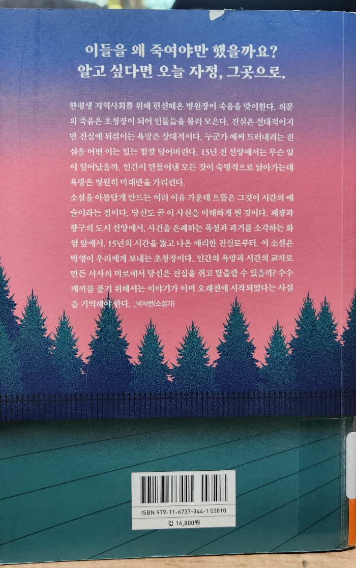 < 책을 읽고> 첫 장을 펼치자마자 단 숨에 읽어 내려간 소설책은 정말 오랜만인 것 같다. 가독성 몰입감이 너무 좋아서 읽으면서도 영화의 한 장면처럼 뇌리에 팍팍 박히고 군더더기 없는 인물들 묘사와 지루할 틈이 없는 현재와 15년 전 사건을 오가는 흥미진진한 구성에 감탄이 절로 나왔다. 박영 작가님 책을 더 찾아 읽어봐야겠다. ^^
